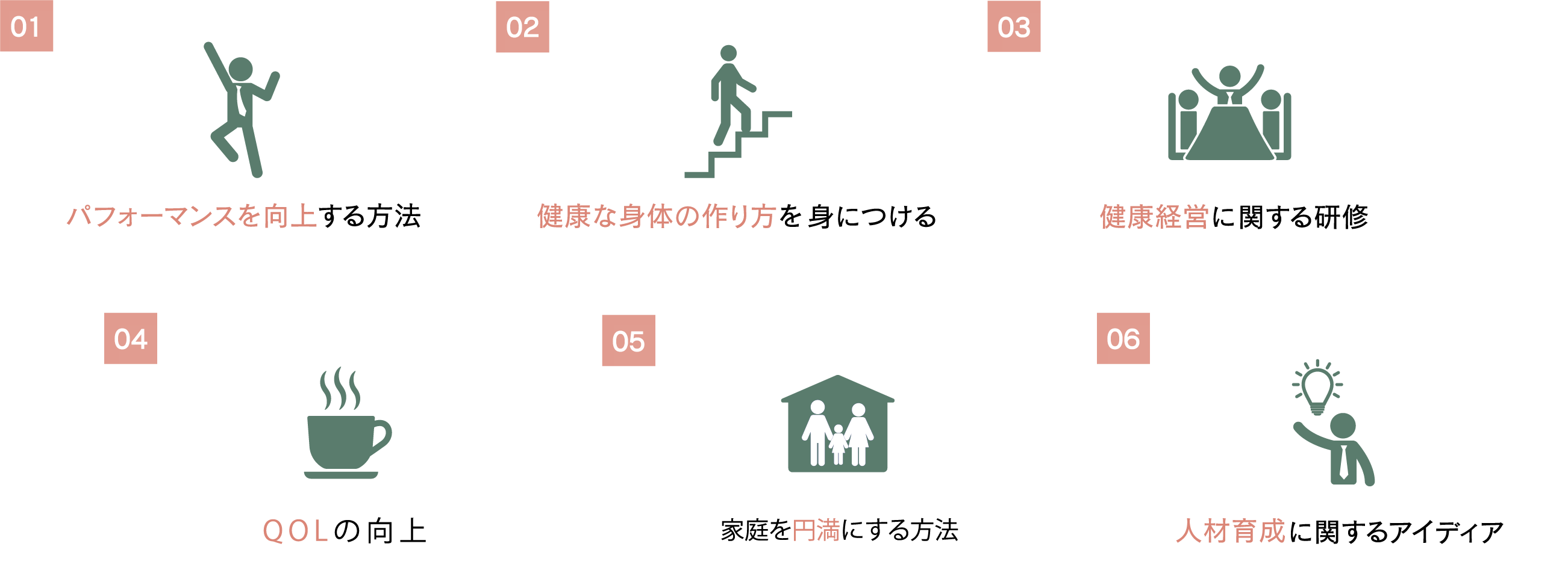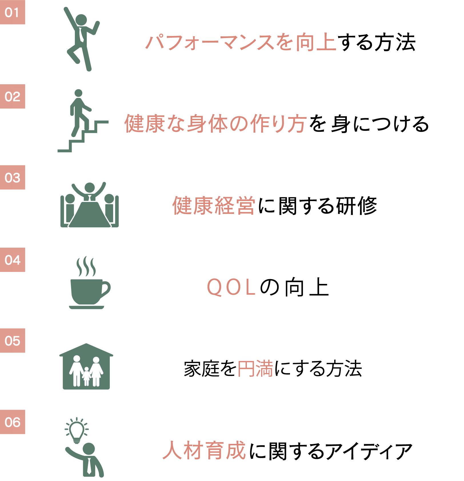 セミナー内容としては、社員一人ひとりが自分の健康を守ることの大切さを伝えるということをテーマに、自分にとっての幸せとは何か、健康の作り方や薬に頼らない身体づくり、子育てや家庭に関連したアドバイスも可能です。